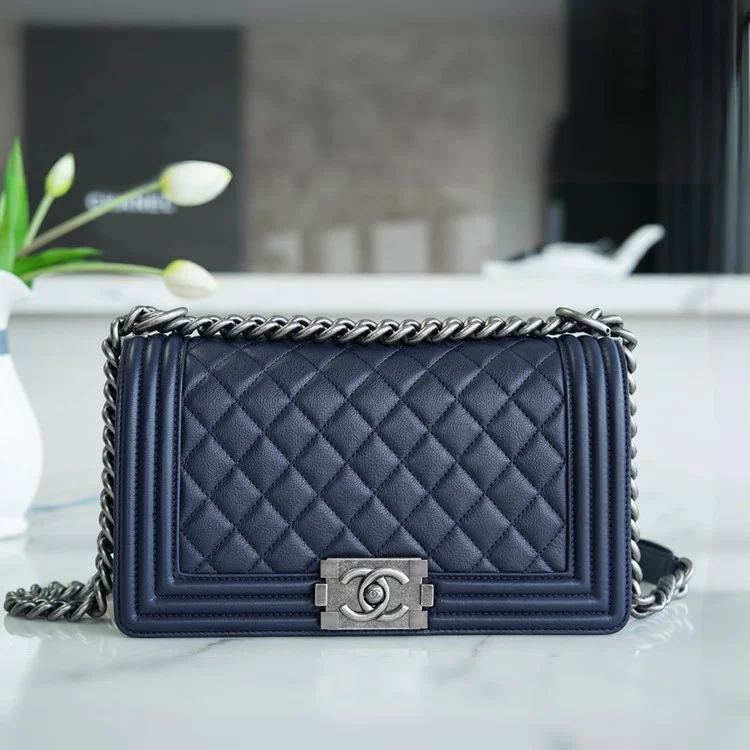 샤넬 보이백 미디엄 다크 블루 은장 캐비어