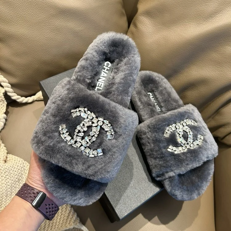 샤넬 CC 시어링 뮬 슬리퍼 그레이