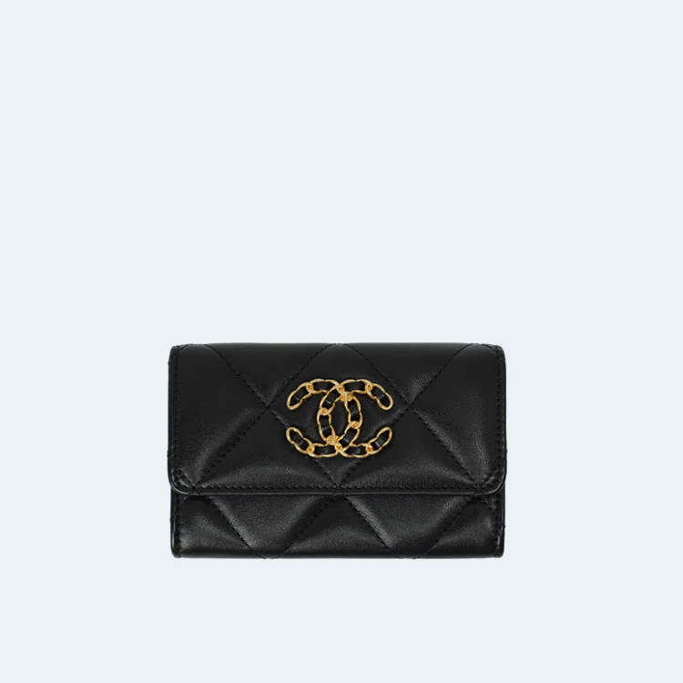 샤넬 19 플랩 카드 홀더 램스킨 & 골드 메탈